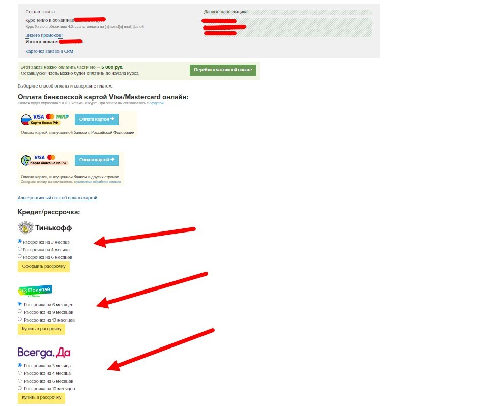 После нажатия кнопки и перехода на страницу оплаты у вас будет возможность выбрать банковскую рассрочку